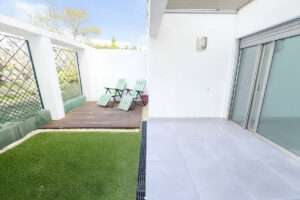 Desde el salón, se accede a una terraza parcialmente cubierta y a un espacio abierto que se extiende hasta un jardín privado con césped y atractivas vistas a la zona comunitaria, lo que lo convierte en un lugar ideal para cenar al aire libre o relajarse.