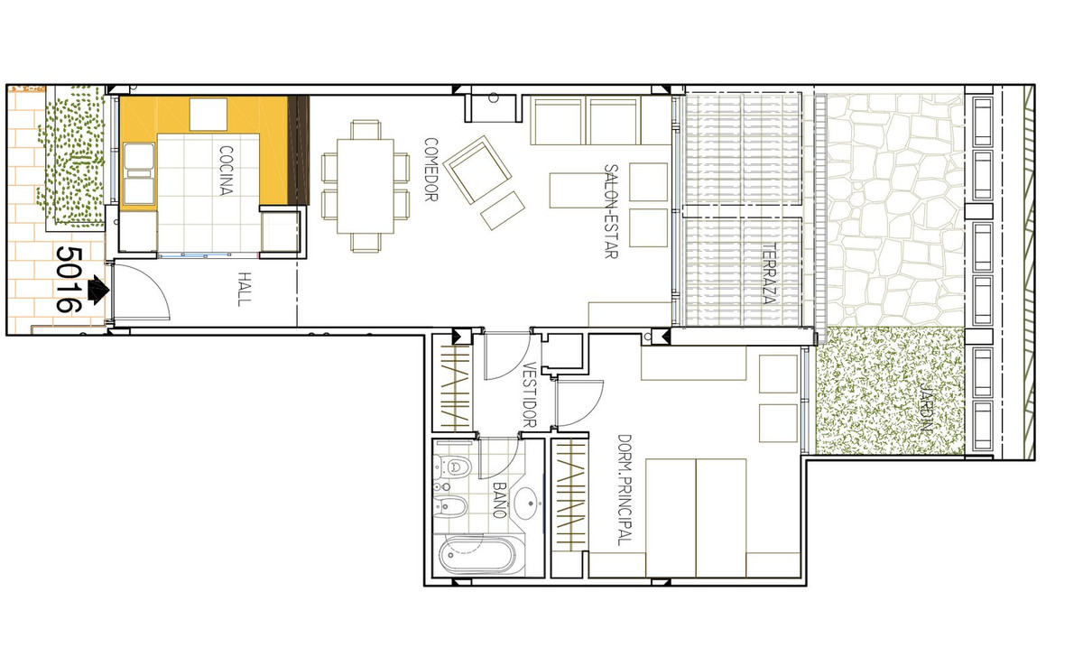 Desde el salón, se accede a una terraza parcialmente cubierta y a un espacio abierto que se extiende hasta un jardín privado con césped y atractivas vistas a la zona comunitaria, lo que lo convierte en un lugar ideal para cenar al aire libre o relajarse.
