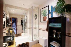 El piso cuenta con un baño completo y un dormitorio espacioso, perfecto para descansar después de un día en la playa o explorando la ciudad.