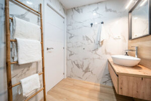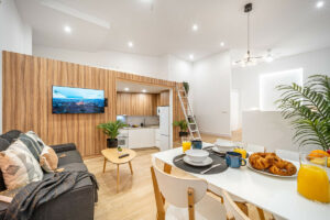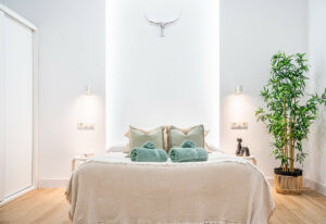 El interior está decorado con un diseño minimalista de estilo nórdico, detalles artísticos y una cocina de diseño equipada con todos los electrodomésticos, incluyendo lavavajillas.