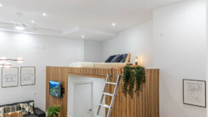 Los techos de hasta 4 metros de altura crean una sensación de gran amplitud en toda la planta. Un altillo de 13 m² aprovecha la altura adicional, ofreciendo un nivel adicional con espacio para una cama doble u otros usos.