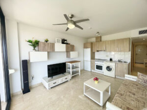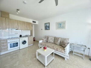 La propiedad cuenta con un dormitorio amplio con armarios empotrados y ventilador de techo, baño totalmente reformado con ducha y un luminoso salón abierto conectado a cocina totalmente equipada con frigorífico/congelador, horno y lavadora. Desde el salón se accede a una amplia terraza con vistas panorámicas al mar y zonas verdes, ideal para disfrutar todo el año.