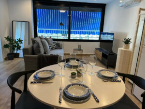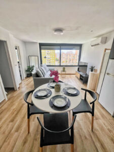 Vivienda muy luminosa, completamente reformada y amueblada, con acabados de calidad: suelo de gres porcelánico, armario, carpintería exterior de aluminio, aire acondicionado y puerta principal de seguridad.