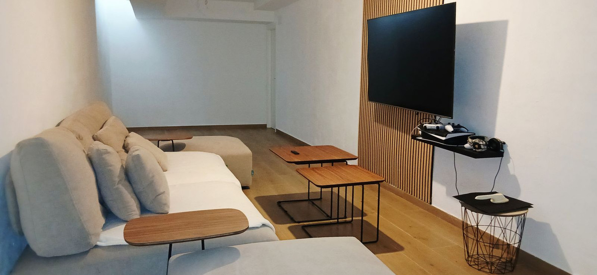 El salón ofrece un ambiente luminoso y acogedor y se convierte en el verdadero corazón de la vivienda. Desde aquí, se accede directamente a la planta inferior de la propiedad, aportando una dimensión adicional de espacio y versatilidad al apartamento.