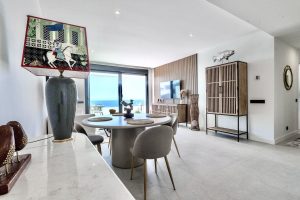 El apartamento cuenta con un amplio salón-comedor de planta abierta con una elegante cocina moderna totalmente equipada, complementada por grandes ventanales que conectan a la perfección el interior con la generosa terraza. Desde aquí, podrá disfrutar de inolvidables amaneceres y atardeceres sobre el Mediterráneo.