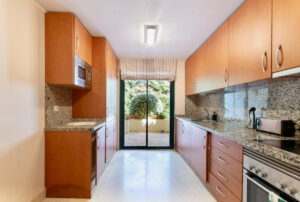 La cocina moderna, semiabierta, está completamente equipada con electrodomésticos de alta gama. Ambos dormitorios son amplios, con armarios empotrados y acceso a su propio balcón privado. Cuenta
