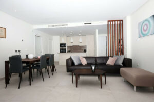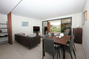 La propiedad ofrece dos amplios dormitorios, uno de ellos una luminosa suite principal con baño en suite, además de una moderna cocina totalmente equipada con electrodomésticos Bosch de alta gama. El salón, amplio y luminoso, se abre a una terraza orientada al oeste que permite disfrutar de vistas despejadas y espectaculares puestas de sol.