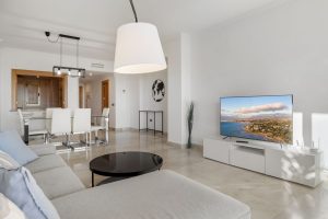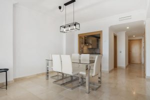El apartamento consta de dos amplios dormitorios y dos baños modernos, y se presenta con un acabado impecable. Diseñada para ofrecer comodidad durante todo el año, la propiedad cuenta con calefacción por suelo radiante, mientras que tanto el dormitorio principal como el salón disfrutan de impresionantes vistas al mar, creando un ambiente luminoso y relajante.