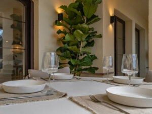 Tanto el salón como la cocina tienen acceso directo a una amplia terraza cubierta. La terraza dispone de una cómoda zona lounge y un agradable espacio para sentarse, con fácil acceso a la cocina. Gracias a la combinación perfecta de sol y sombra, es un lugar ideal para disfrutar al aire libre durante todo el año, manteniendo además la vivienda fresca y agradable.