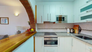 Cuenta con 2 dormitorios amplios, un baño completo, y una cocina actualizada que conecta con el salón mediante un pasaplatos, ideal para integrarla y crear un espacio abierto y moderno. Todo con orientación oeste, lo que garantiza luz natural por la tarde y puestas de sol en la terraza.