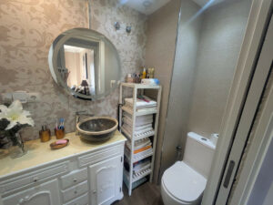 Dos baños: El incluido en el dormitorio principal cuanta con un plato de ducha de pizarra, columna de hidromasaje con agua de lluvia y mampara de cristal. Lavabos de piedra natural.