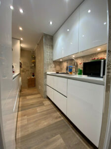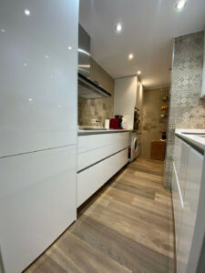 Amplia cocina independiente completamente amueblada con gran capacidad de almacenaje y electrométricos panelados. Cuenta con lavadora, lavavajillas, horno, microondas, placa de inducción, campana extractora, grifería ducha bimando, etc. Encimera de silestone.