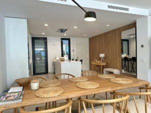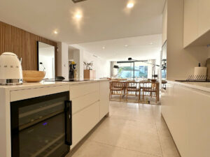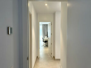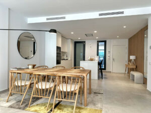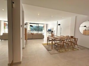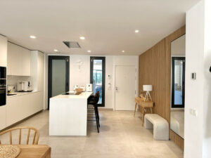 El apartamento cuenta con una amplia sala de estar de planta abierta que combina a la perfección la sala de estar, la moderna cocina y el recibidor, creando un espacio luminoso y sofisticado. La distribución de suelo a techo conduce a una terraza cubierta, perfecta para cenar al aire libre, relajarse o disfrutar del entretenimiento en cualquier época del año.