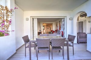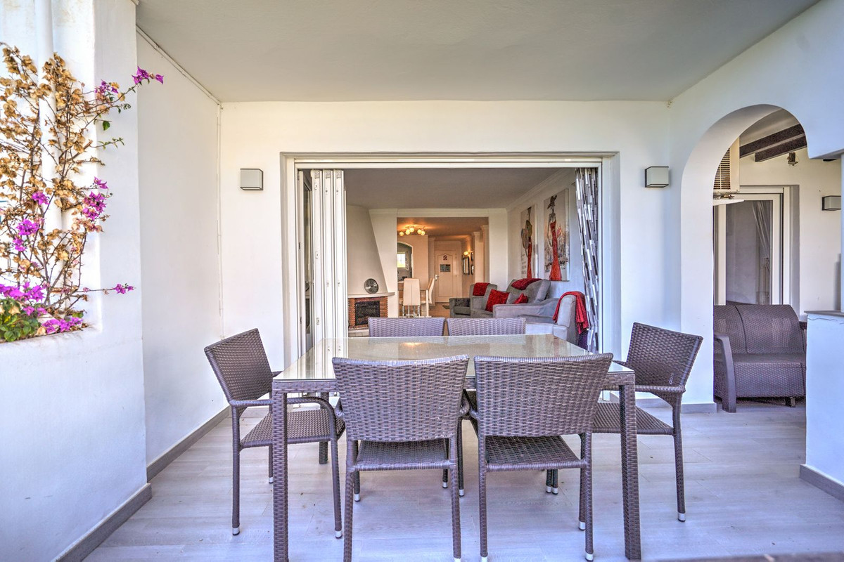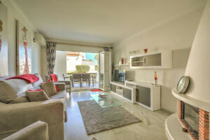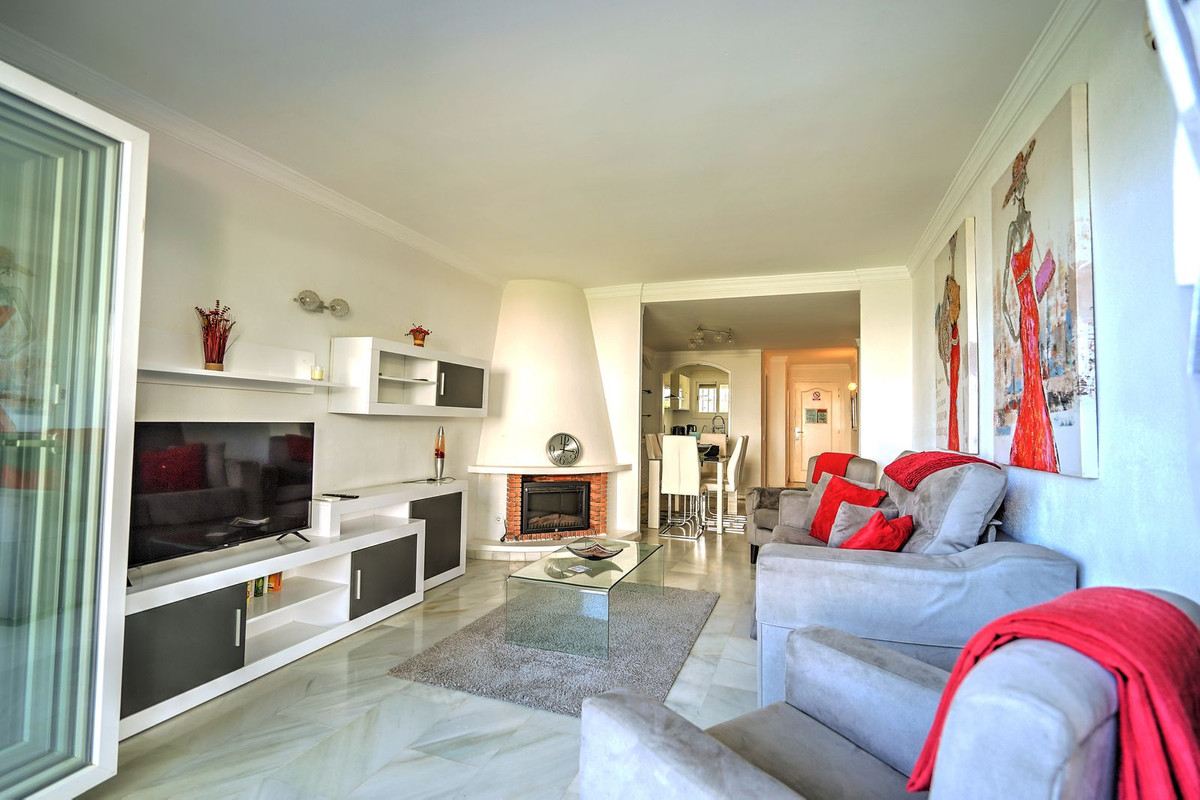 En el interior, el apartamento ha sido cuidadosamente renovado, con una cocina recientemente actualizada que incluye un pasaplatos hacia el comedor. El luminoso salón cuenta con chimenea y modernas puertas plegables que se abren por completo para extender el espacio hacia la terraza. El dormitorio principal tiene acceso a su propia terraza, persianas eléctricas y un baño en suite renovado. Un segundo dormitorio doble y un baño elegante con bañera completan el interior.