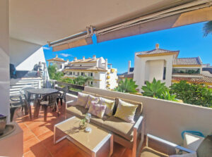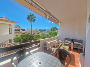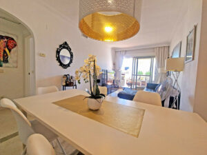 Este encantador y luminoso apartamento cuenta con dos dormitorios y dos baños (uno de ellos en suite). El amplio salón-comedor se abre a una soleada terraza orientada al sur, desde la que se disfrutan agradables vistas a los cuidados jardines comunitarios, al campo de golf y parcialmente al mar. La cocina, totalmente equipada e independiente, ofrece funcionalidad y la posibilidad de integrarse fácilmente con la zona de comedor para crear un espacio abierto si se desea. La vivienda dispone de suelos de mármol en todas las estancias, Aire Acondicionado, doble acristalamiento y se vende completamente amueblada.