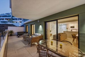 La propiedad cuenta con una cocina abierta de diseño, perfectamente integrada con un luminoso y amplio salón, que conecta directamente con una generosa terraza, ideal para relajarse o disfrutar con invitados mientras se contemplan las vistas. Ambos dormitorios se encuentran en la parte trasera de la vivienda, proporcionando mayor privacidad y confort.