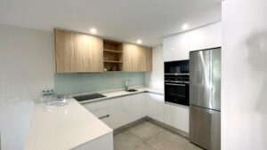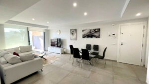 El apartamento se encuentra en la planta intermedia. Cuenta con 2 dormitorios, 2 baños, salón con cocina abierta y una terraza cubierta con jardín orientado al sur.
