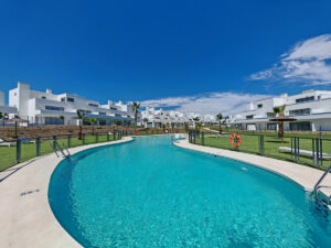 Apartamento en venta en Cancelada, Estepona con 2 dormitorios, 2 baños, 1 baño en suite y con orientación oeste, con piscina comunitaria, garaje privado (1 plazas) y jardín comunitario. Respecto a las dimensiones, la propiedad presenta 91 m² construidos, 73 m² en interior y 18 m² de terraza. Tiene las siguientes características servicios cercanos, transporte cercano, aire acondicionado, calefacción central, cocina totalmente equipada, trastero, sala de invitados, almacén, gimnasio, alarma, cristal doble, videoportero, a estrenar, salón, persianas de seguridad, lavadero, internet – wi-fi, 24 horas de servicio, comunidad cerrada, ascensor, vistas a la piscina, sin amueblar, parque infantil cercano, cerca de playa / mar, cerca del golf, tiendas cerca, cerca de la ciudad, colegios cerca y cámaras de vigilancia.