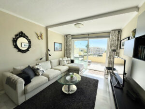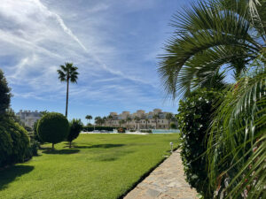 La amplia terraza es perfecta para relajarse bajo el sol, con vistas a las palmeras, los jardines y el resplandeciente Mediterráneo. El apartamento también incluye una plaza de aparcamiento subterráneo privado y un trastero.