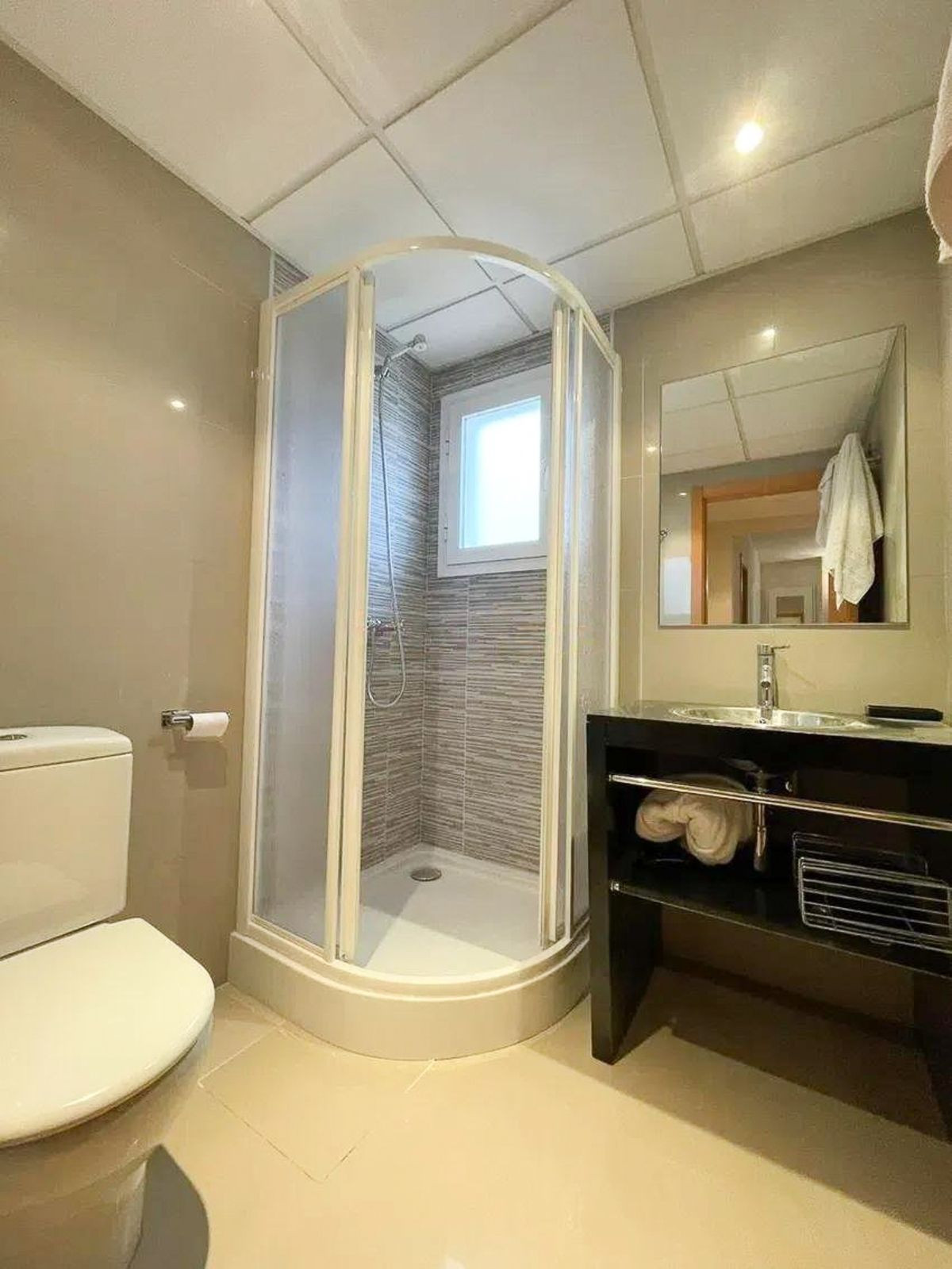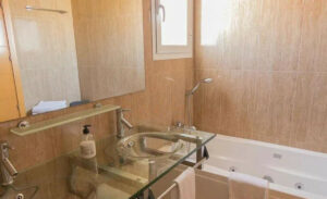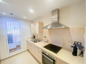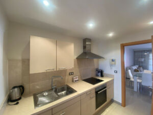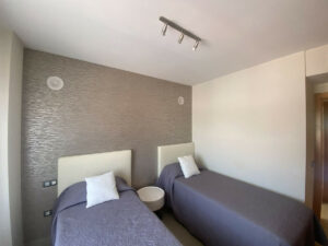 La vivienda dispone de dos cómodos dormitorios: uno con cama doble y baño en suite con bañera de hidromasaje, y otro con dos camas individuales y baño independiente con ducha. El salón-comedor, amplio y luminoso, conecta con una cocina completamente equipada, ideal para estancias largas o vacacionales.