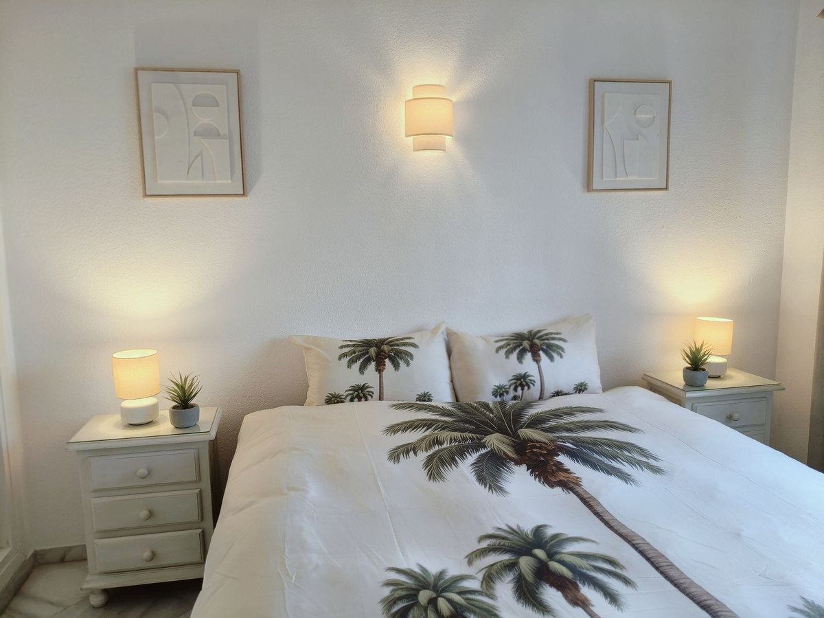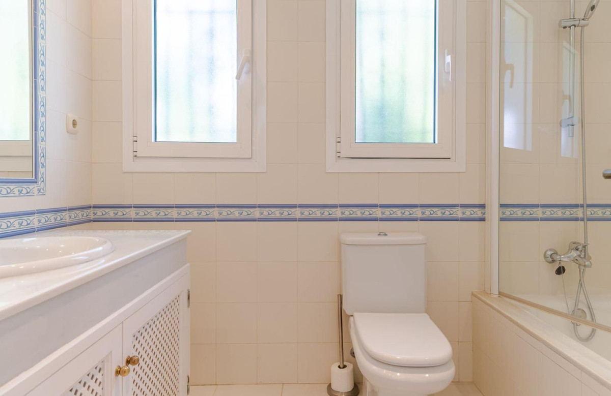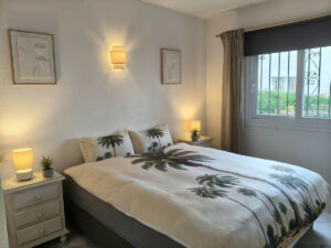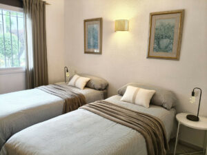 El dormitorio principal cuenta con una cama super king, armarios de doble panel y vistas a los jardines tropicales. El lujoso baño principal adyacente, de estilo andaluz, cuenta con un impecable mueble de lavabo integrado de mármol blanco con carpintería blanca a medida, bañera de porcelana con ducha, ventanas dobles y focos integrados en el techo. Otro dormitorio de invitados con baño en suite ofrece dos camas con hermosas vistas al jardín.