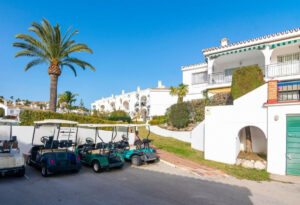 Acceso directo al green del campo de golf El Paraíso Alto desde el carrito de golf y desde el aparcamiento para residentes de la comunidad, con amplias plazas de aparcamiento exclusivas para propietarios e invitados. Jardines residenciales con palmeras tropicales impecablemente cuidados e impresionante piscina con cascada de golf, diseñados en el característico jardín andaluz con flores y senderos de baldosas que decoran exquisitamente la comunidad.