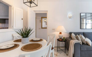 Desde un espacioso y cuidado patio andaluz, con amplios armarios de almacenamiento y servicios instalados, la entrada conduce a una cocina con paneles de madera Mayfair color menta, electrodomésticos Balay y opulentas superficies de mármol verde, complementada con exquisitos azulejos de paredes y suelos con detalles, diseñada con una práctica puerta corredera con paneles de madera que da al salón y a la terraza exterior con buganvillas fucsias frente a los jardines. Suelos de mármol blanco y gris claro en toda la sala de estar, ventanas térmicas de doble aislamiento de alta gama, mosquiteras integradas, persianas opacas instaladas, nuevo aire acondicionado LG Dual Inverter en todas las habitaciones, muebles de salón nuevos, camas nuevas y cocina renovada con lavavajillas. El lujoso salón-comedor ofrece acceso a una impresionante terraza de doble orientación con tumbonas y una zona de solárium con vistas a los altos jardines tropicales repletos de palmeras y a sus impresionantes jardines.