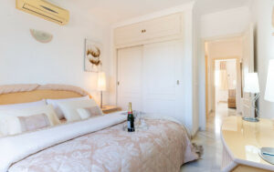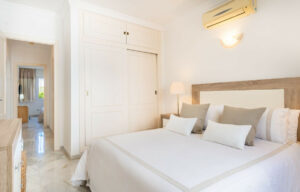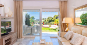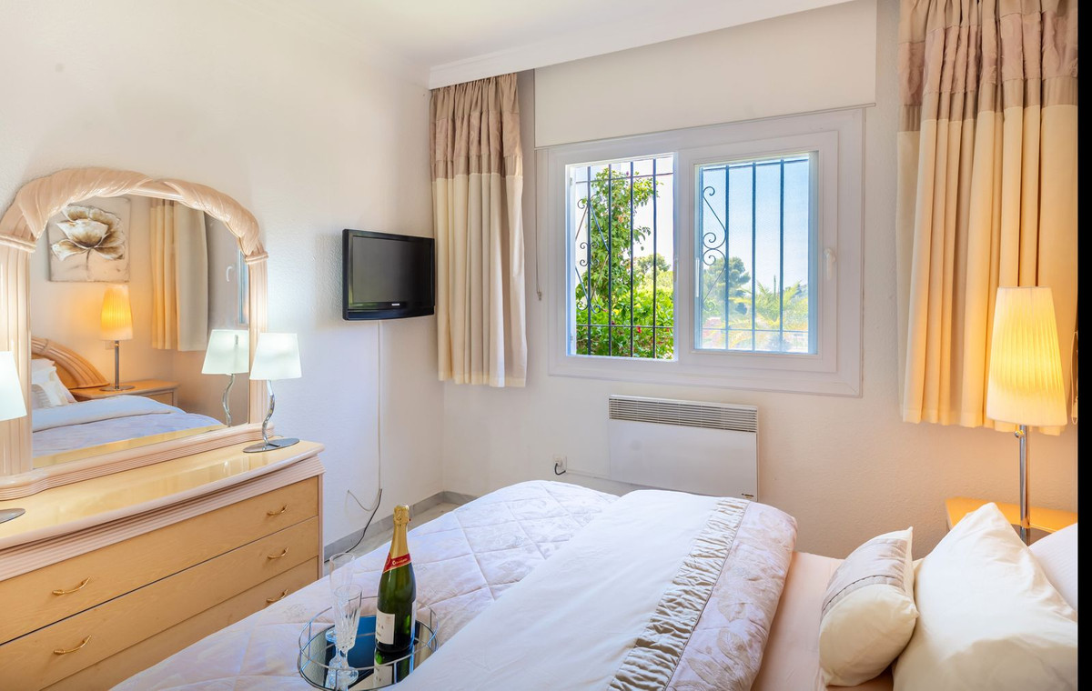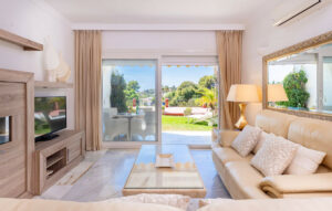 Desde la entrada, que consta de un patio cerrado de estilo andaluz con trastero y servicios integrados, la puerta de entrada da acceso al pasillo, que da acceso a una lujosa cocina completamente renovada con paneles blancos estilo Mayfair, equipada con electrodomésticos Bosch integrados y superficies de granito gris de lujo con una ventana que realza las hermosas vistas. Impresionante salón-comedor de planta abierta con muebles de mármol crema de lujo, sofás de cuero crema claro a juego, muebles altos de roble claro y ventanales de alta gama que ofrecen vistas exquisitas y acceso a la terraza exterior para comer y relajarse, con un amplio jardín situado frente a la terraza. El dormitorio principal cuenta con una suite con muebles lacados de lujo y un espacioso baño principal contiguo renovado. Impresionante dormitorio doble de invitados con baño en suite renovado. Aire acondicionado en todas las estancias. La terraza exterior de la propiedad está cubierta y equipada con un toldo extensible sobre la exquisita zona de jardín, que ofrece un comedor de ratán de alta calidad y tumbonas.