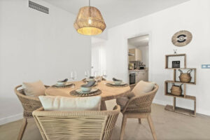 Este apartamento de planta baja tiene dos dormitorios con un amplio salon comedor, cocina totalmente equipada con lavadero independiente, y dos dormitorios, uno con bano en suite, y otro dormitorio con bano familiar.