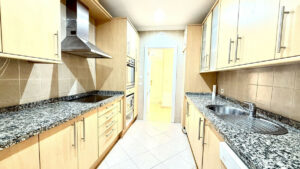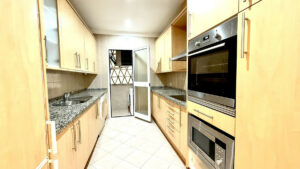 La cocina, completamente equipada, es independiente y dispone de lavadero. Gracias a su posición elevada, el apartamento goza de privacidad y vistas despejadas, sin renunciar al fácil acceso a los jardines y la zona de piscina comunitaria.
