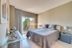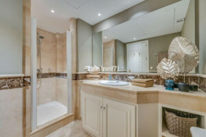 El dormitorio principal es espacioso, con cama de matrimonio, armarios empotrados y cuarto de baño en suite con lavabo doble. El segundo dormitorio es también de generosas dimensiones, con cama de matrimonio y acceso directo a la terraza. Los dos amplios cuartos de baño están revestidos de elegante mármol y disponen de calefacción por suelo radiante.