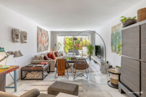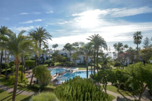 Alcazaba Beach magnífico apartamento con gran terraza, vistas al jardín, piscina y vistas parciales al Mediterráneo, en exclusiva urbanización frente al mar, con acceso directo a la playa, chiringuito y restaurante on site, parking comunitario, seguridad 24 horas, preciosos jardines tropicales muy bien cuidados, 6 piscinas (una climatizada), pistas de tenis y de pádel. Se encuentra en las afueras de Estepona, con todo tipo de servicios alrededor y a tan solo 5 minutos en coche del puerto deportivo y a 10 minutos de Puerto Banús.