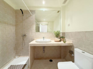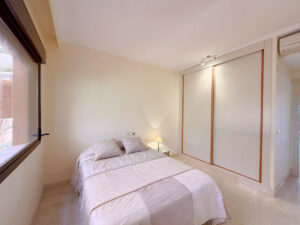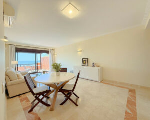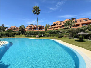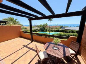 Situado en una primera planta, esta magnífica propiedad combina privacidad, confort y un entorno natural inmejorable. A tan solo 200 metros de playas excepcionales, dentro de un complejo residencial perfectamente cuidado, con exuberantes jardines tropicales y una gran piscina disponible todo el año. Ubicado entre los puertos de Estepona y La Duquesa, ambos a 5 minutos en coche, donde encontrará una amplia oferta de comercios, restaurantes, ocio y prestigiosos campos de golf. La vivienda cuenta con 2 dormitorios y 2 baños (uno de ellos en-suite) Amplio y luminoso salón, orientado al sureste con acceso directo a una generosa terraza desde la que se disfrutan vistas panorámicas al mar, la piscina y los jardines. La cocina está equipada e incluye un práctico lavadero independiente. Además, dispone de plaza de garaje subterránea y trastero. Una propiedad con mucho encanto que lo tiene todo para disfrutar del estilo de vida mediterráneo.