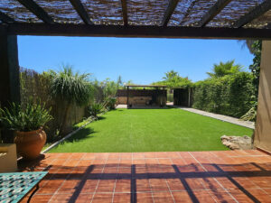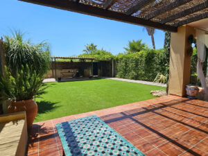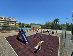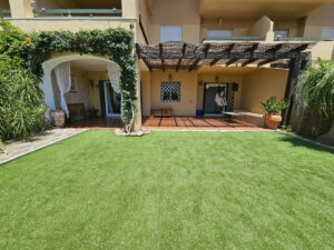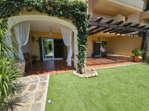 Este fantástico apartamento de 2 dormitorios ofrece un espacio exterior excepcional, con terraza cubierta y un amplio jardín privado con zona de barbacoa, pérgola y acceso directo a la piscina, pista de pádel y parque infantil. Esta propiedad se encuentra en la zona de Selwo de Estepona, cerca de Resina Golf, el nuevo Club Deportivo de Pádel y el Colegio Americano. El apartamento es una planta baja con orientación sur, lo que garantiza sol todo el día. Dispone de 2 dormitorios y 2 baños. El dormitorio principal tiene baño en suite con vestidor y acceso directo a la terraza cubierta y al jardín. La cocina se ha ampliado para incluir una cocina de servicio con acceso directo a una segunda terraza. El salón-comedor es luminoso y cuenta con abundante luz natural, con acceso directo a la fantástica terraza y al jardín. Hay aire acondicionado frío/calor en todo el apartamento. El precio incluye una plaza de aparcamiento subterráneo y un ascensor lleva desde la puerta del apartamento hasta la planta del garaje. Hay amplio aparcamiento en la calle para invitados o para quienes tengan más de un coche. La comunidad está bien cuidada, con solo 32 apartamentos, y ofrece una gran piscina, un parque infantil y una pista de pádel para uso de los residentes.