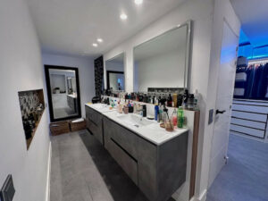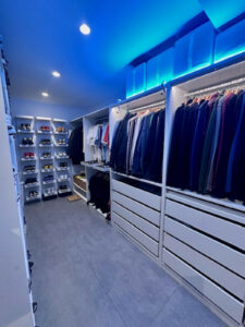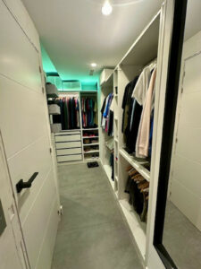 Un enorme vestidor bien dividido, con luces y fabricado a medida.