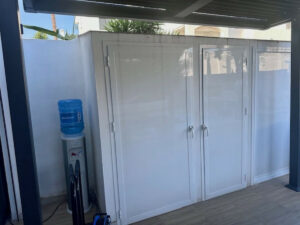 En el porche, tenemos un gran espacio de almacenamiento cerrado para todos los utensilios de jardin.
