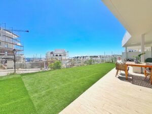 El verdadero punto fuerte de esta propiedad es su gran terraza cubierta, que conecta todas las estancias, incluyendo el salón, la cocina y ambos dormitorios. Este espacio exterior excepcional está diseñado para disfrutar del estilo de vida mediterráneo, con una zona de estar amueblada con sofás, un espacio de barbacoa y una parte privada con césped natural donde podrá crear su propio rincón verde. Desde aquí se disfrutan preciosas vistas al mar, convirtiendo la terraza en el lugar perfecto para relajarse o recibir invitados durante todo el año.