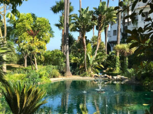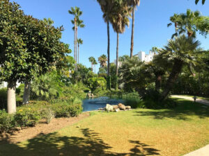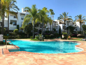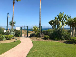 Precioso apartamento de 90 m2 con 2 habitaciones y 2 baños, terraza con vistas ajardinadas y salida directa a la playa en exclusiva urbanización de Estepona.