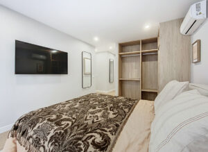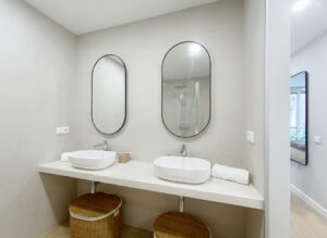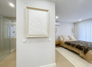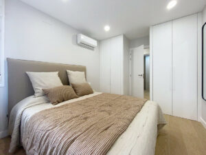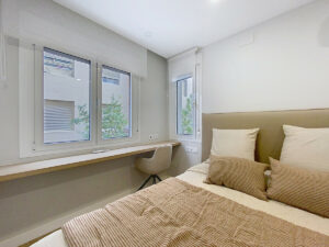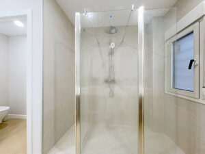 El apartamento cuenta con dos dormitorios, con fácil posibilidad de crear un tercer dormitorio, con armarios empotrados y acabados modernos. El dormitorio principal dispone de un amplio baño privado con ducha de gran tamaño, mientras que el segundo baño también está completamente equipado y mantiene la misma línea de diseño actual. Los acabados incluyen suelos de porcelana en las zonas húmedas y doble acristalamiento en todas las ventanas, garantizando confort y eficiencia.