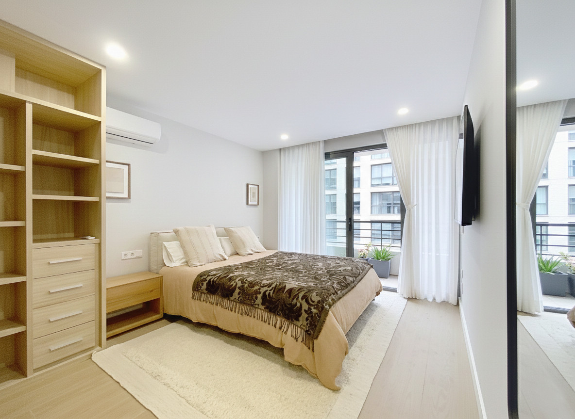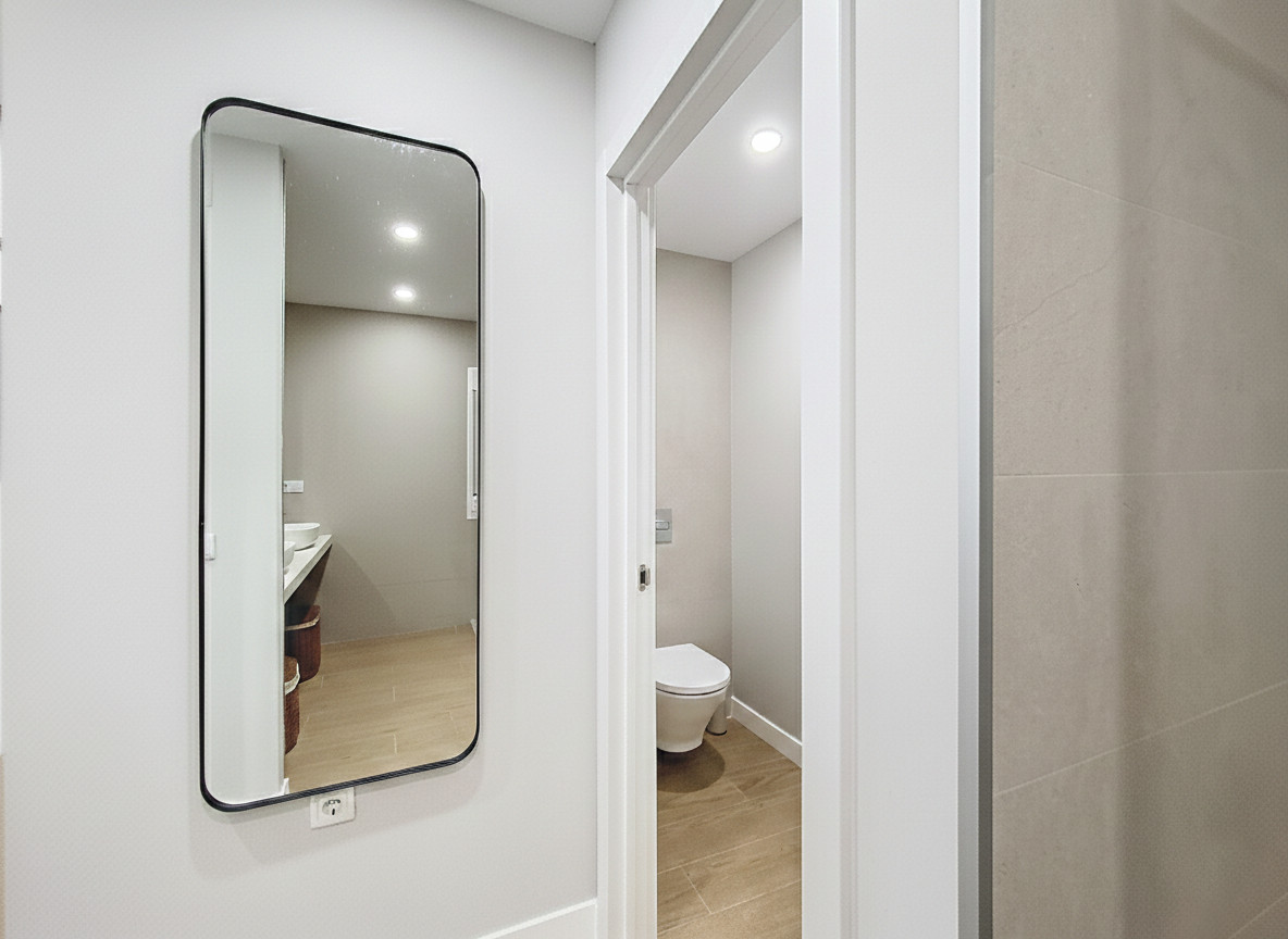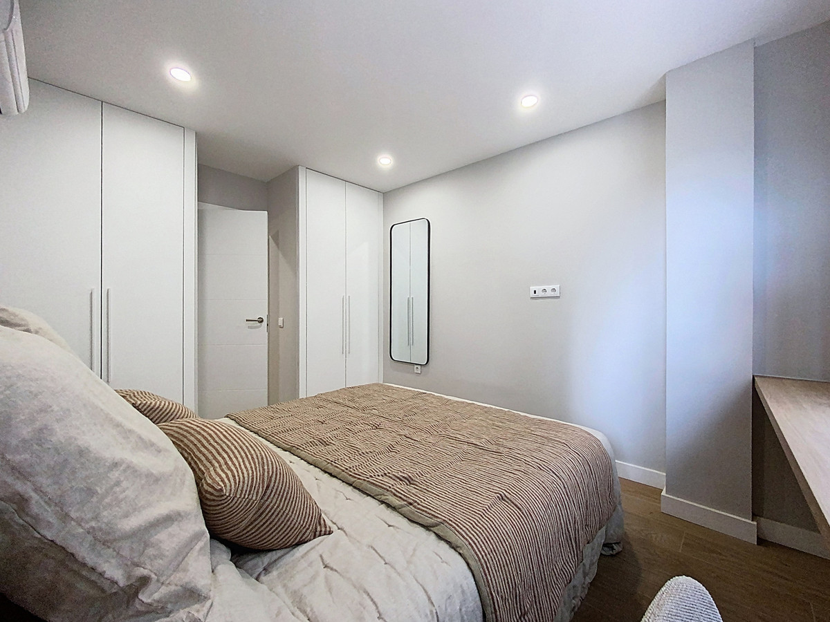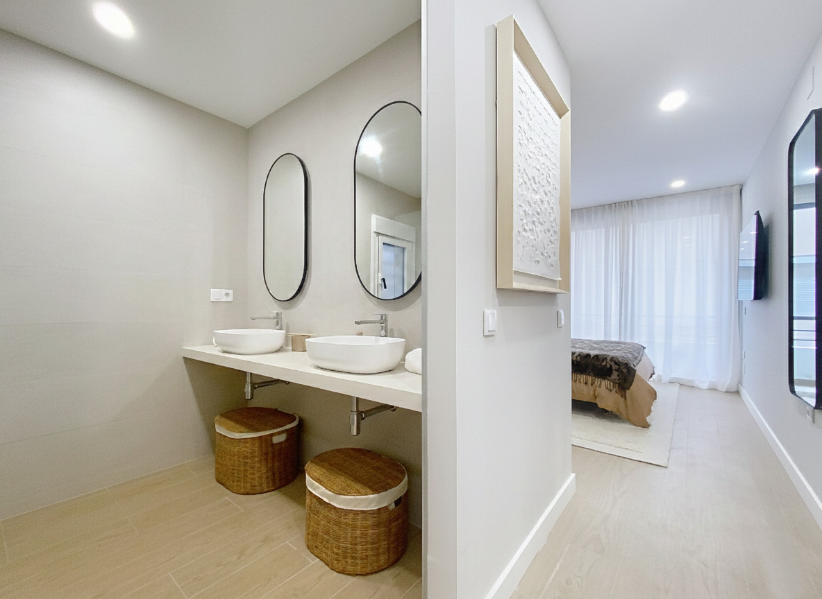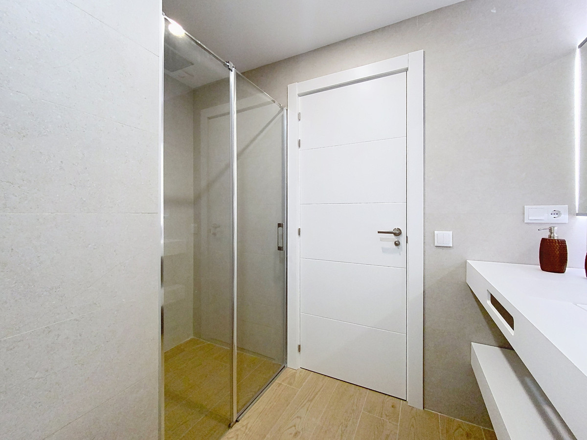 El apartamento cuenta con dos dormitorios, con fácil posibilidad de crear un tercer dormitorio, con armarios empotrados y acabados modernos. El dormitorio principal dispone de un amplio baño privado con ducha de gran tamaño, mientras que el segundo baño también está completamente equipado y mantiene la misma línea de diseño actual. Los acabados incluyen suelos de porcelana en las zonas húmedas y doble acristalamiento en todas las ventanas, garantizando confort y eficiencia.