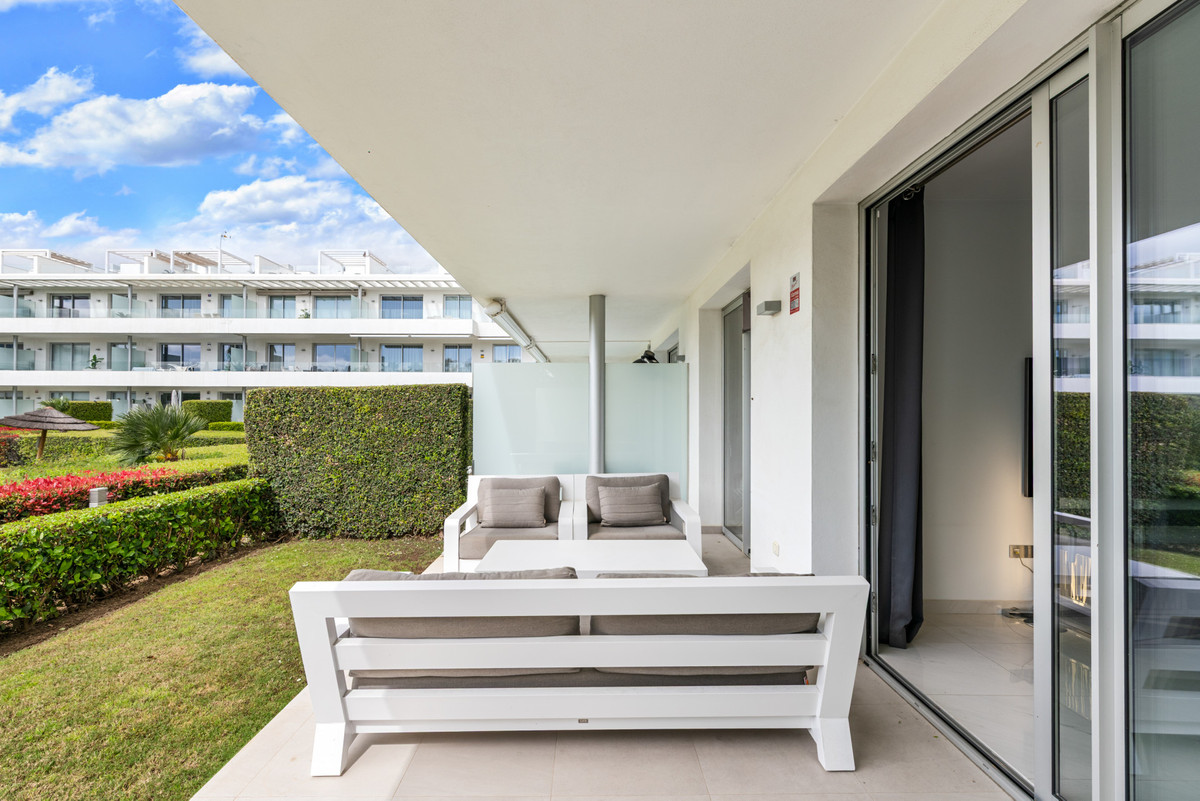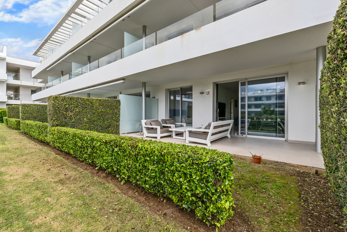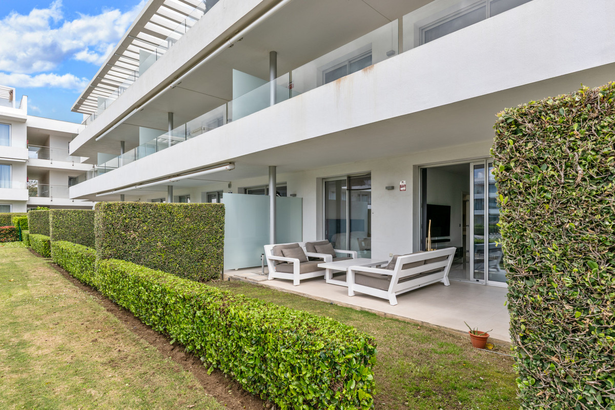 Moderno apartamento de dos dormitorios, situado en planta baja, con orientación oeste, sol por la tarde y acceso directo a los jardines comunitarios y a la piscina.