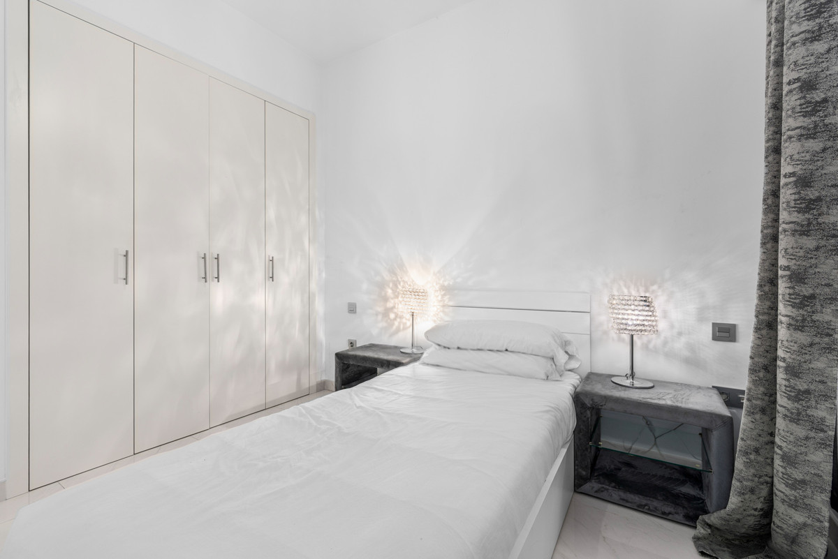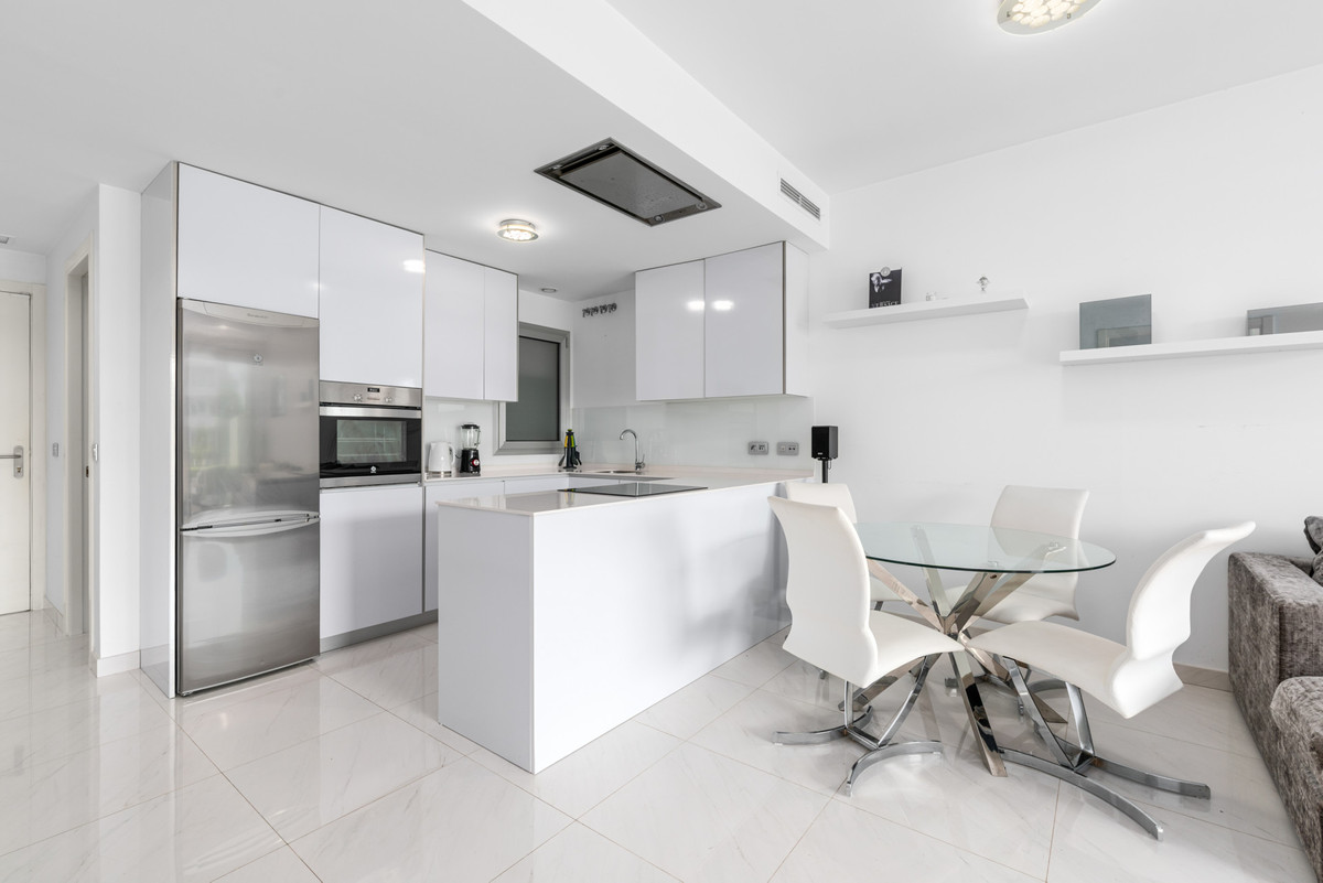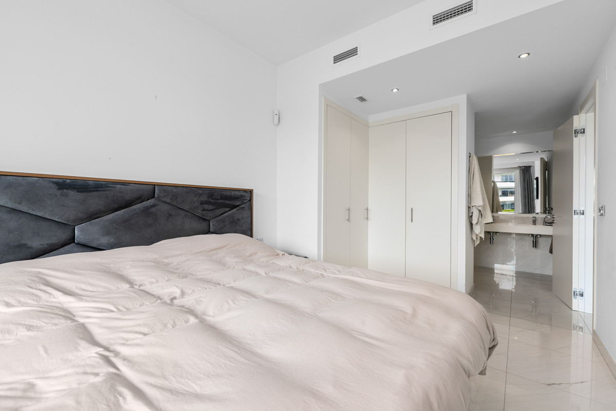 La propiedad cuenta con dos dormitorios, ambos con armarios empotrados. El dormitorio principal tiene un cuarto de baño en suite y acceso directo a la amplia terraza privada.