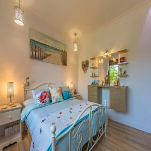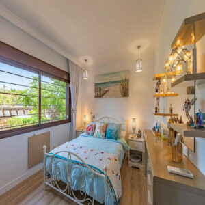 La vivienda, construida con materiales de alta calidad, cuenta con dos amplios dormitorios, una cuidada reforma en la iluminación que realza cada espacio y una práctica bomba antical para mayor comodidad. Desde la terraza se disfrutan agradables vistas a los exuberantes jardines, la piscina comunitaria y vista parcial al mar.