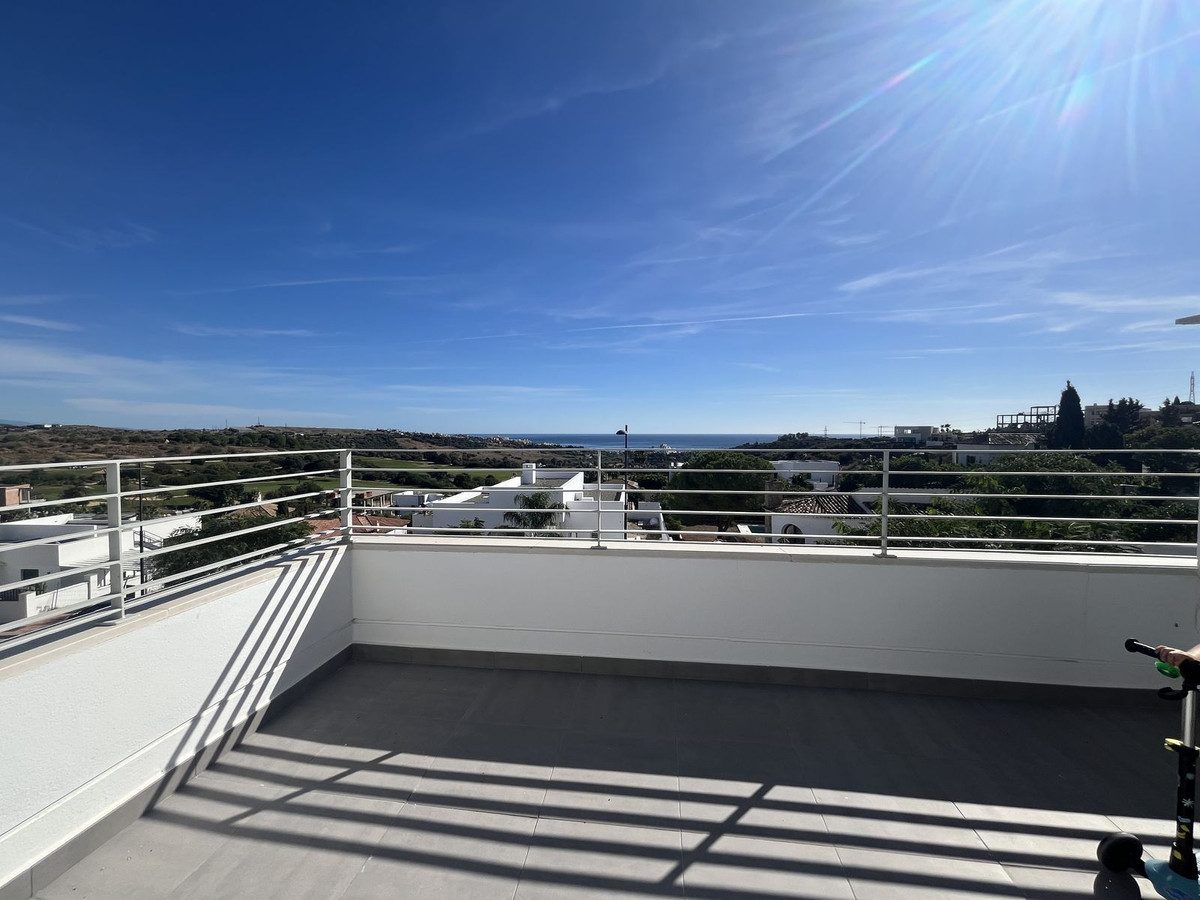 Vida al aire libre: la espaciosa terraza ofrece el lugar perfecto para desayunar con vistas al amanecer o para relajarse contemplando las verdes calles del campo de golf y el horizonte mediterráneo.