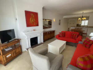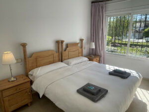 Este apartamento es ideal para familias con niños, ya que al estar situado en la planta baja, permite un acceso directo desde la terraza a la zona de jardines y la piscina. El alojamiento consta de una cocina equipada con lavadora, frigorífico, microondas, horno y vitrocerámica, así como de un salón con sofá cama. El dormitorio principal cuenta con dos camas individuales y un baño en-suite, mientras que el segundo dormitorio tiene dos camas individuales y un baño con ducha.