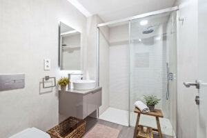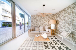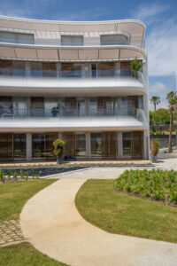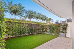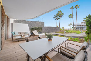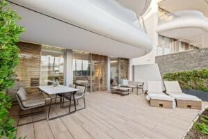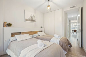 El dormitorio principal cuenta con baño propio, armario empotrado y acceso directo a un jardín exterior privado. El segundo dormitorio también incluye armario empotrado y da a un jardín privado, lo que proporciona a ambas estancias una sensación de amplitud y conexión con la naturaleza. Todo el mobiliario del apartamento es de primera calidad, lo que realza su ambiente refinado y moderno.