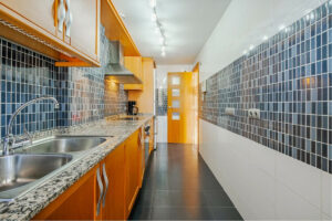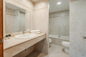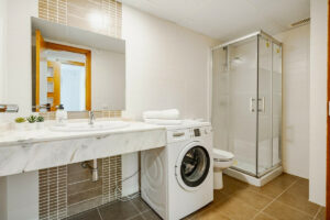 El espacioso salón se abre directamente a la terraza, creando una experiencia de vida interior-exterior sin interrupciones. El apartamento cuenta con dos amplios dormitorios, ambos con acceso a la terraza, y dos baños, incluyendo uno en suite en el dormitorio principal.