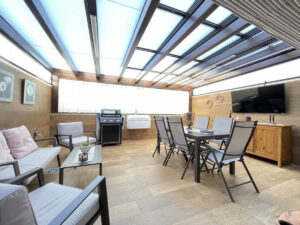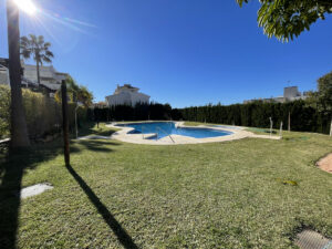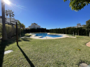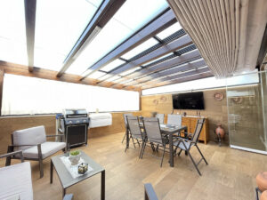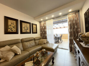La estancia principal se conecta con una gran terraza privada, ideal para disfrutar de reuniones sociales o aprovechar la zona de barbacoa. El conjunto residencial ofrece espacios comunes como piscina y jardín, permitiendo disfrutar de momentos de ocio sin salir del recinto. Además, la propiedad se encuentra en una urbanización cerrada con cámaras de vigilancia, lo que incrementa la seguridad.