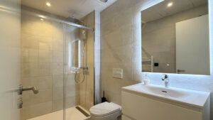 Cuenta con 2 dormitorios y 2 baños. El dormitorio principal tiene un baño abierto con ducha, espejos antiniebla, toalleros eléctricos y armarios empotrados.