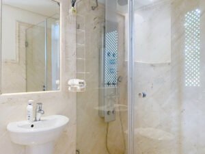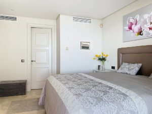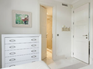 El apartamento ofrece dos dormitorios con baño en suite, concebidos como espacios privados y confortables. La suite principal disfruta de vistas al mar desde la propia cama, acceso directo a la terraza, e incluye un baño privado con doble lavabo, amplia ducha y una elegante bañera de hidromasaje, convirtiéndose en un auténtico refugio de descanso y bienestar. Los baños están equipados con encimeras de mármol TRAVERTINO NAVONNA, grifería HANSGROHE y aparatos sanitarios de primeras marcas como Jacuzzi y Duravit, reflejando un alto nivel de detalle y calidad en cada acabado.